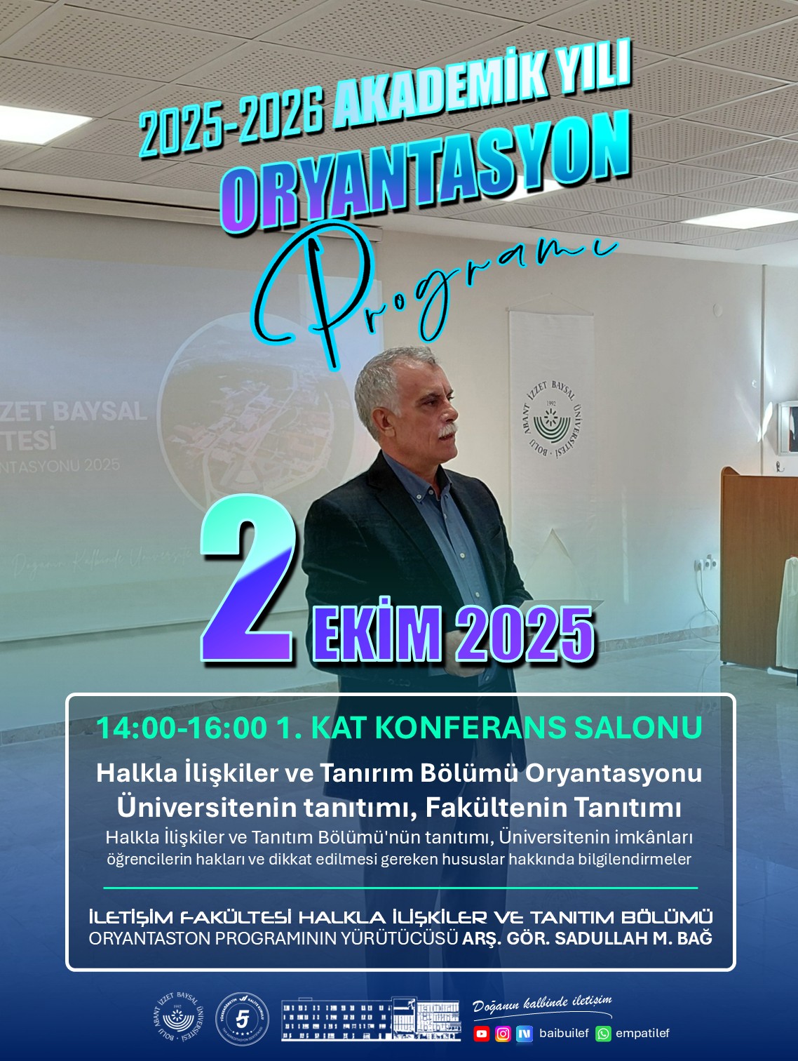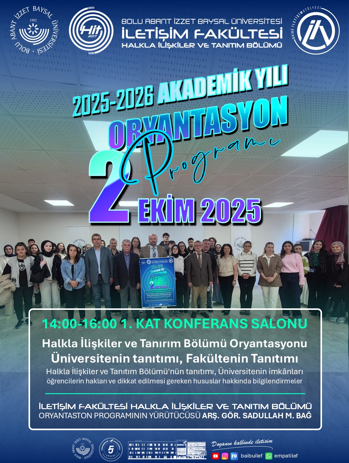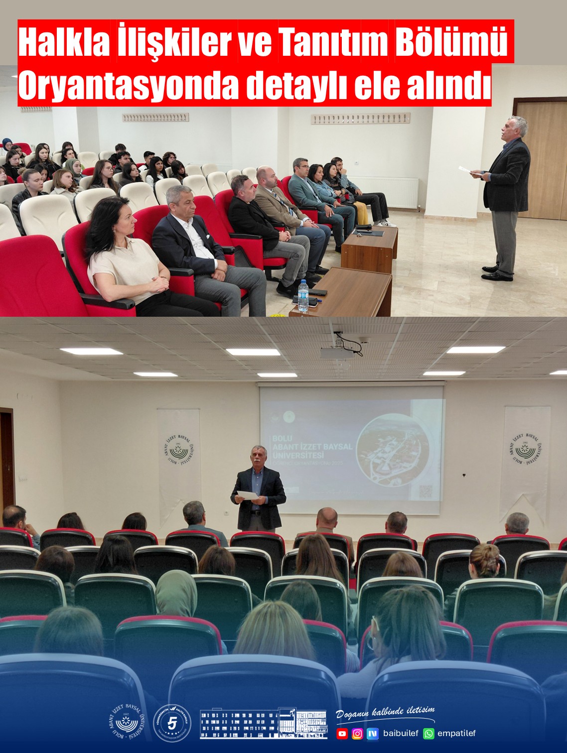 The Public Relations and Publicity Department, one of the most established and robust academic units within the Faculty of Communication at Bolu Abant İzzet Baysal University, held a magnificent orientation program for its new students on October 2, 2025. The program, held in the Faculty Conference Hall, once again demonstrated the department's extensive academic knowledge, strong vision, and student-centered approach to education.